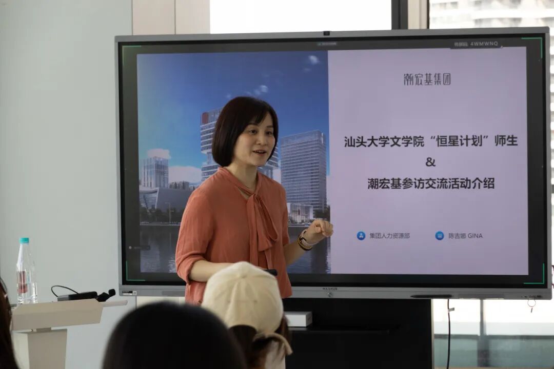 随后,公司师生走访广东潮宏基实业股份有限公司。工作人员带领同学们进行参观,介绍了公司主要特色、定位、发展历程,并与潮宏基人事部负责人Gina经理进行交流座谈。Gina经理为同学们介绍了品牌、部门、结构等企业信息,同时通过案例形式,针对实习就业、面试流程等问题进行深入交流。