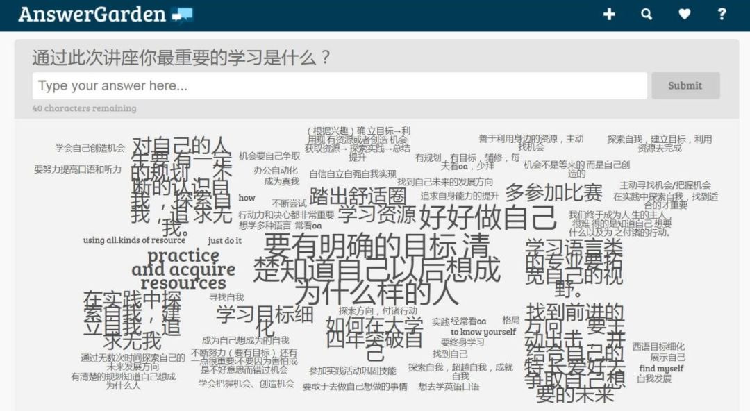 最后,吴老师通过问卷形式了解同学们从本次讲座中学习到的最重要的内容,同学们纷纷反馈要有明确的目标,清楚以后想成为什么样的人。
