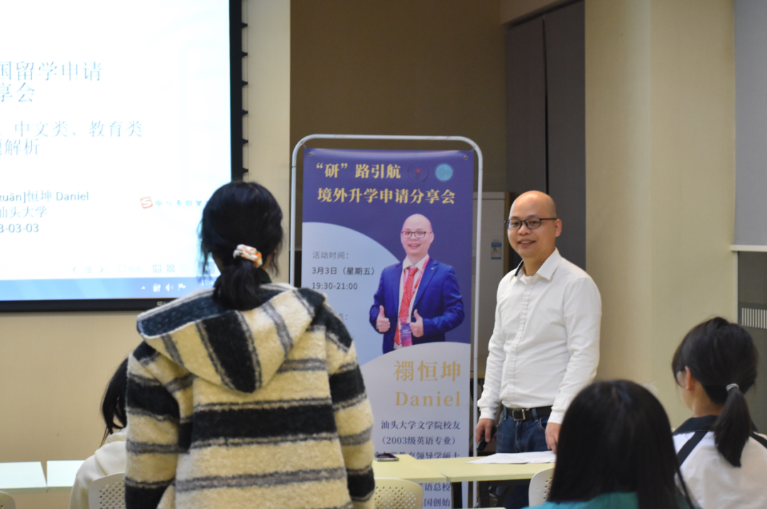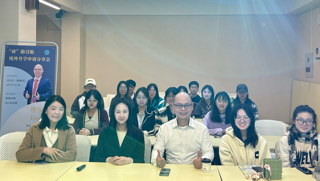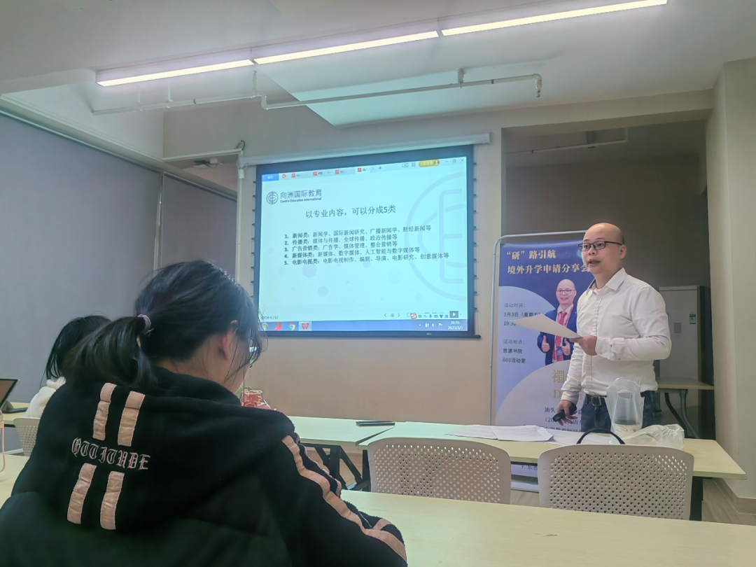 2023年3月3日晚,“研”路引航之境外升学申请分享会在思源603活动室顺利举行。本次分享会由VSport员工、2007届英语专业毕业生禤恒坤进行主讲。公司党委副书记吴锳凡、公司团委副书记陈醒通以及有意向申请留学的同学们参加了本次分享会。
