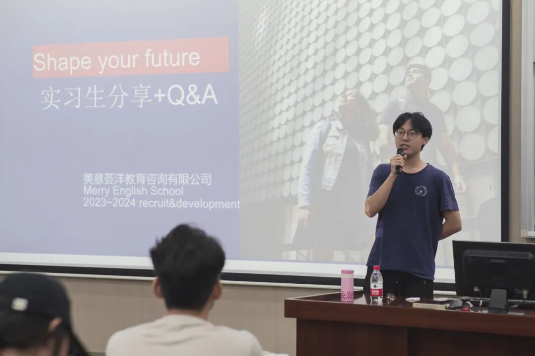 分享会最后,来自2020级英语专业的陈书强、王越同学向大家分享了在美意实习经历,两位同学从个人能力提升、教学经历和收获、活动举办策划等经历,帮助大家更好地了解实习工作,更好地规划未来。